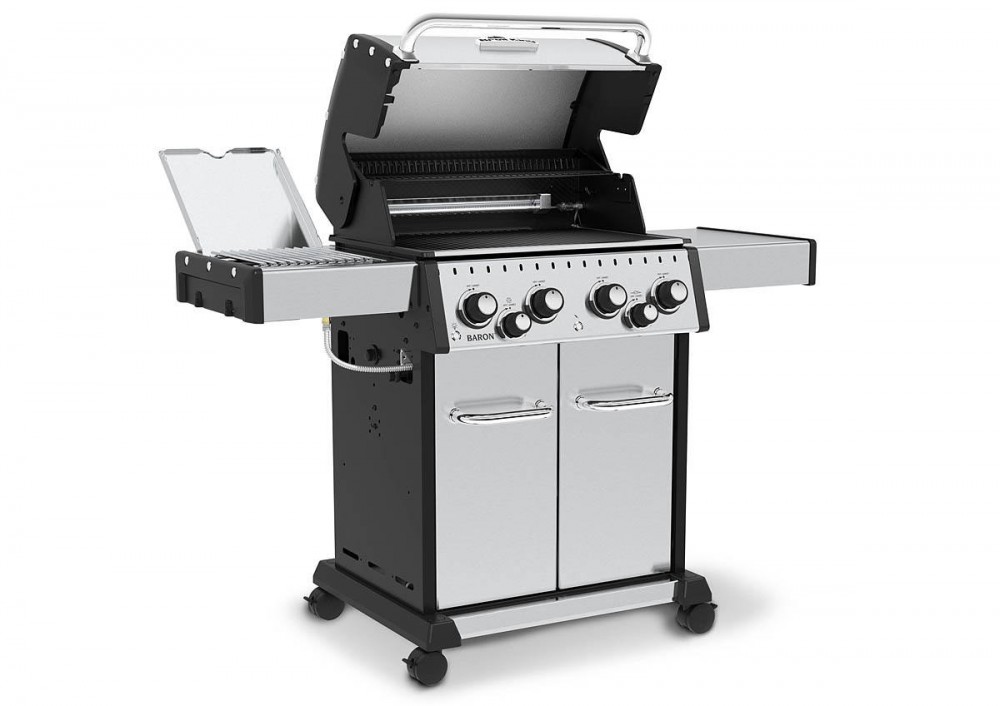 A Baron sorozat közepes méretű modelljei közé tartozik a négy égőfejes Baron S 490 IR gázgrill. A kiváló alapanyagokból gyártott modell remek hőszigetelő képességekkel bír, melyek lehetővé teszik, hogy minimális felfűtéssel is hatékonyan dolgozzon. Az öntött alumínium sütőteret rozsdamentes acél rácsok teszik legyőzhetetlenné a kerti sütögetések terén. A gázgrill kétajtós tárolószekrénnyel és két oldalsó rakodó polccal érkezik, amelyek egyaránt szolgálják a praktikumot és a kényelmet. A Baron S 490 IR hozza a Broil King gázgrillek precizitását, a könnyű hőfokszabályozását és a minden húsfélével tökéletesen dolgozó Dual-Tube égőfejeket. Az elsősorban városi környezetbe szánt elegáns grill kisebb teraszokra is ideális, karbantartása egyszerű, mozgatása mindenki számára egyszerűen megoldható, strapabíró kerekeinek hála. A grill beépített rotiserrie szettel érkezik, hogy a nyárson sütés se maradjon ki a grillrepertoárból. Ajánlott gázpalack: szabvány 11 kg-os töltősúlyú, 300 mm átmérőjű, PB gázpalack, mely praktikusan elhelyezhető az alsó „szekrényben”.